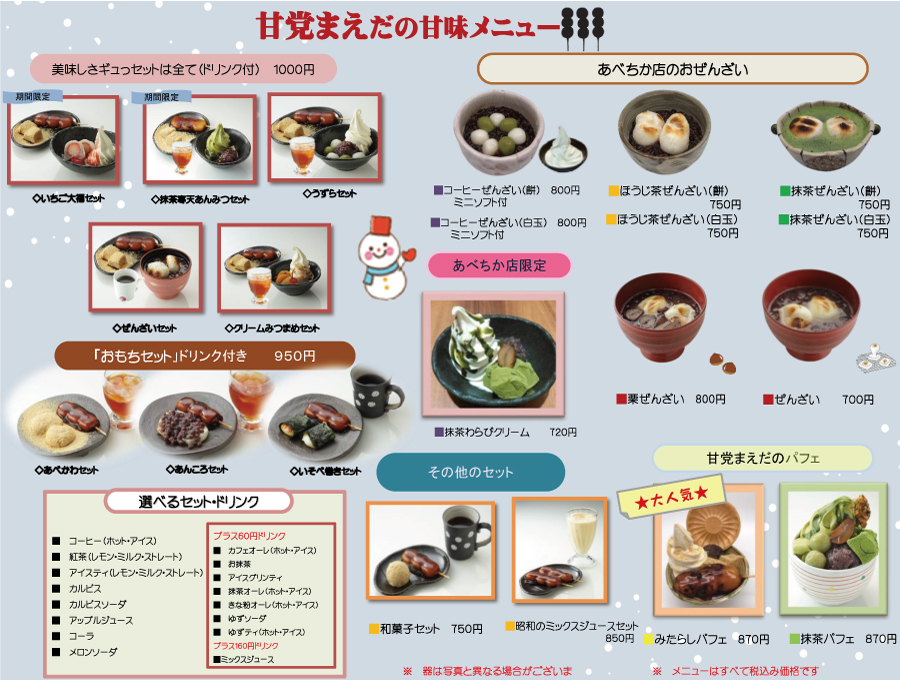 昔ながらの和スウィーツをほっこり楽しむ。多彩なセットメニューがうれしい。 創業以来、守り続ける一番人気のみたらし団子の味と価格。 あんこや寒天、ソフトクリームなど自家製に こだわっています。 テイクアウトコーナーもございますので、お土産にもどうぞ 昭和43年のオープン以来の人気メニューが今も変わらず愛されています。 日本伝統の和菓子を味わいながら、ほっこりとした美味しい時間をお過ごしください。 営業時間 あべちかのHPでご確認下さい。