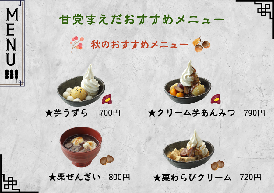 安くて美味しい甘味処「甘党 まえだ」。モチモチのみたらしだんごや、100%自社製造のこだわりのあんこを使用したぜんざいなど、