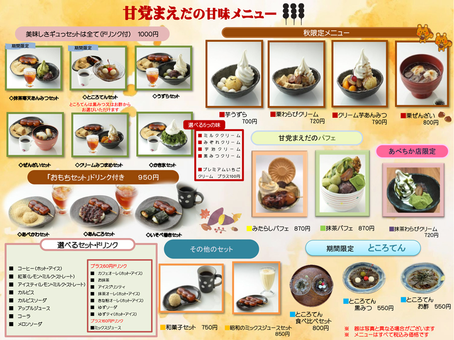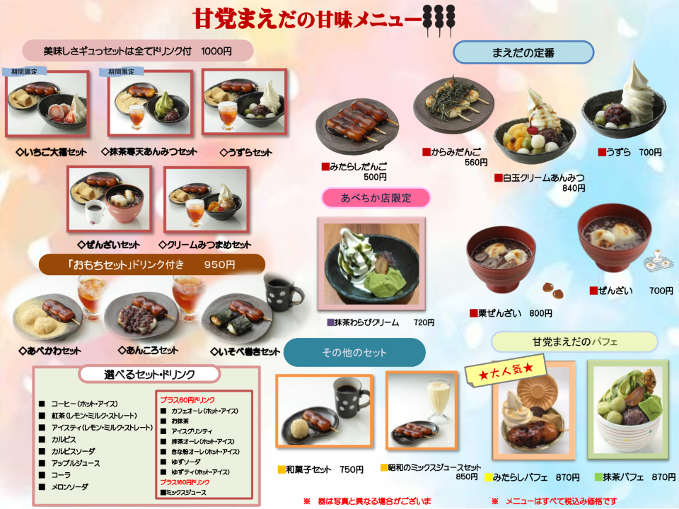 昔ながらの和スウィーツをほっこり楽しむ。多彩なセットメニューがうれしい。 創業以来、守り続ける一番人気のみたらし団子の味と価格。 あんこや寒天、ソフトクリームなど自家製に こだわっています。 テイクアウトコーナーもございますので、お土産にもどうぞ 昭和43年のオープン以来の人気メニューが今も変わらず愛されています。 日本伝統の和菓子を味わいながら、ほっこりとした美味しい時間をお過ごしください。 営業時間 あべちかのHPでご確認下さい。