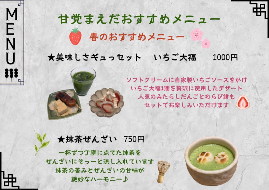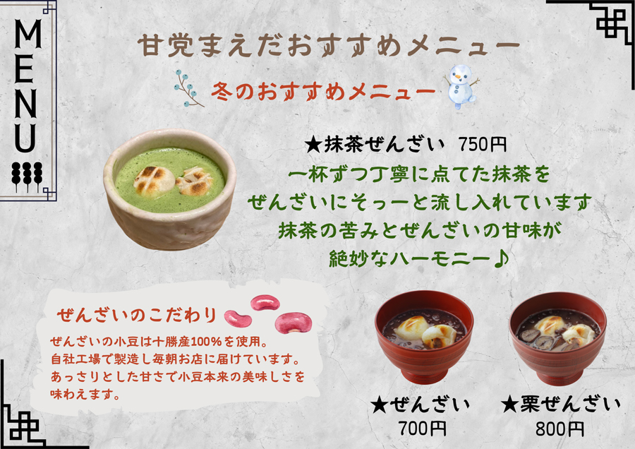 安くて美味しい甘味処「甘党 まえだ」。モチモチのみたらしだんごや、100%自社製造のこだわりのあんこを使用したぜんざいなど、